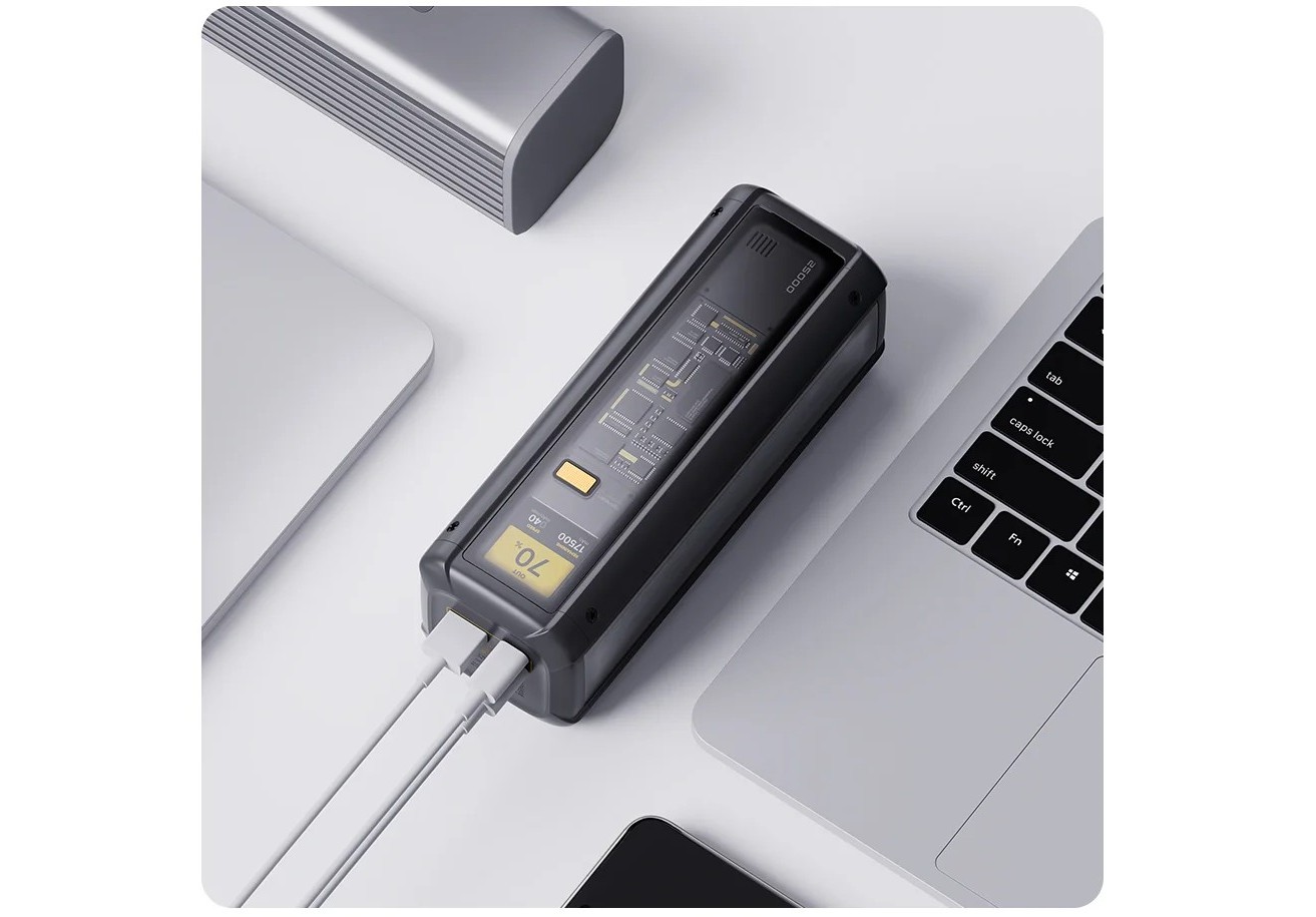 Xiaomi Powerbank 25000 212W удивляет не только своей мощностью, но и дизайном, который нетипичен для продукции компании. Прозрачный корпус позволяет заглянуть внутрь устройства и ощутить всю технологичность процесса зарядки. Этот подход к дизайну не просто декоративен, но и подчёркивает внимание к деталям и эстетическую привлекательность устройства, которое, несмотря на свою техническую направленность, легко станет частью вашего стиля.